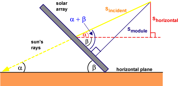 The amount of solar radiation incident on a tilted module surface is the component of the incident solar radiation which is perpendicular to the module surface. The following figure shows how to calculate the radiation incident on a tilted surface (Smodule) given either the solar radiation measured on horizontal surface (Shoriz) or the solar radiation measured perpendicular to the sun (Sincident).