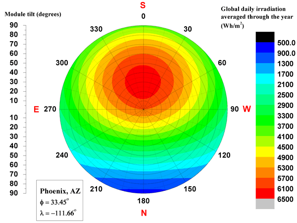 The contour diagram of the global daily irradiation averaged through the year for Phoenix, AZ plotted for different module tilts and orientations. Note, that the number on the color bar corresponds to the peak sun hours, e.g. in Phoenix, if the module is facing South and tilted 40o, it will get about 6 peak sun hours of insolation during the day throughout the year. Click here to see the full size image. The actual data can also be obtained here.