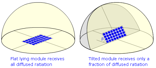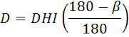 The calculation of diffuse component is more straight forward. From a simple model, assuming isotropic radiation from the whole sky dome, it follows that the module tilted by the angle β will receive just the proportional part of Diffuse Horizontal Irradiation, DHI, provided by TMY.