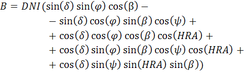 In TMY file one can find both beam and diffuse components of radiation. Beam irradiance implies that it is received by the surface perpendicular to the Sun's rays. The beam component is actually calculated from diffuse and global horizontal irradiances, which are directly measured. For the systems with 2-axis trackers, adjusting themselves to face the sun in the same fashion as sunflowers do, the beam component comes directly from TMY (where it is called Direct Normal Irradiance, DNI). Unfortunately, the vast majority of PV systems are fixed in place and don't rotate. So they receive only a portion of direct sunlight which can be calculated having in mind the system location, module tilt and orientation [1]: