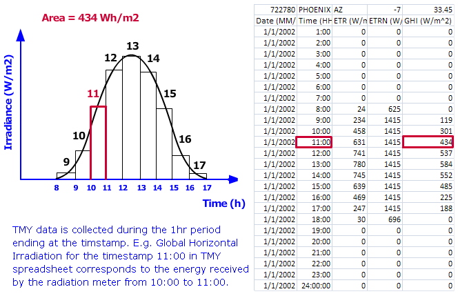 TMY is measured on an hourly bases. The data is accumulated during the 60 min time intervals and is stored in a standardized form as shown on the following figure: