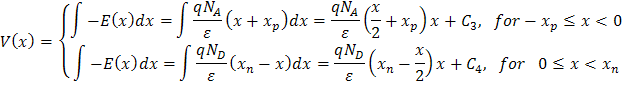 We are usually interested in the potential difference across the junction and can arbitrarily set one side to zero. Here we define the voltage on the p-type side as zero, such that at x= −xp, V=0. This gives the constant C3 as: