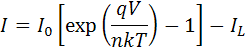 The -1 term in the above equation can usually be neglected. The exponential term is usually >> 1 except for voltages below 100 mV. Further, at low voltages the light generated current IL dominates the I0 (...) term so the -1 term is not needed under illumination.